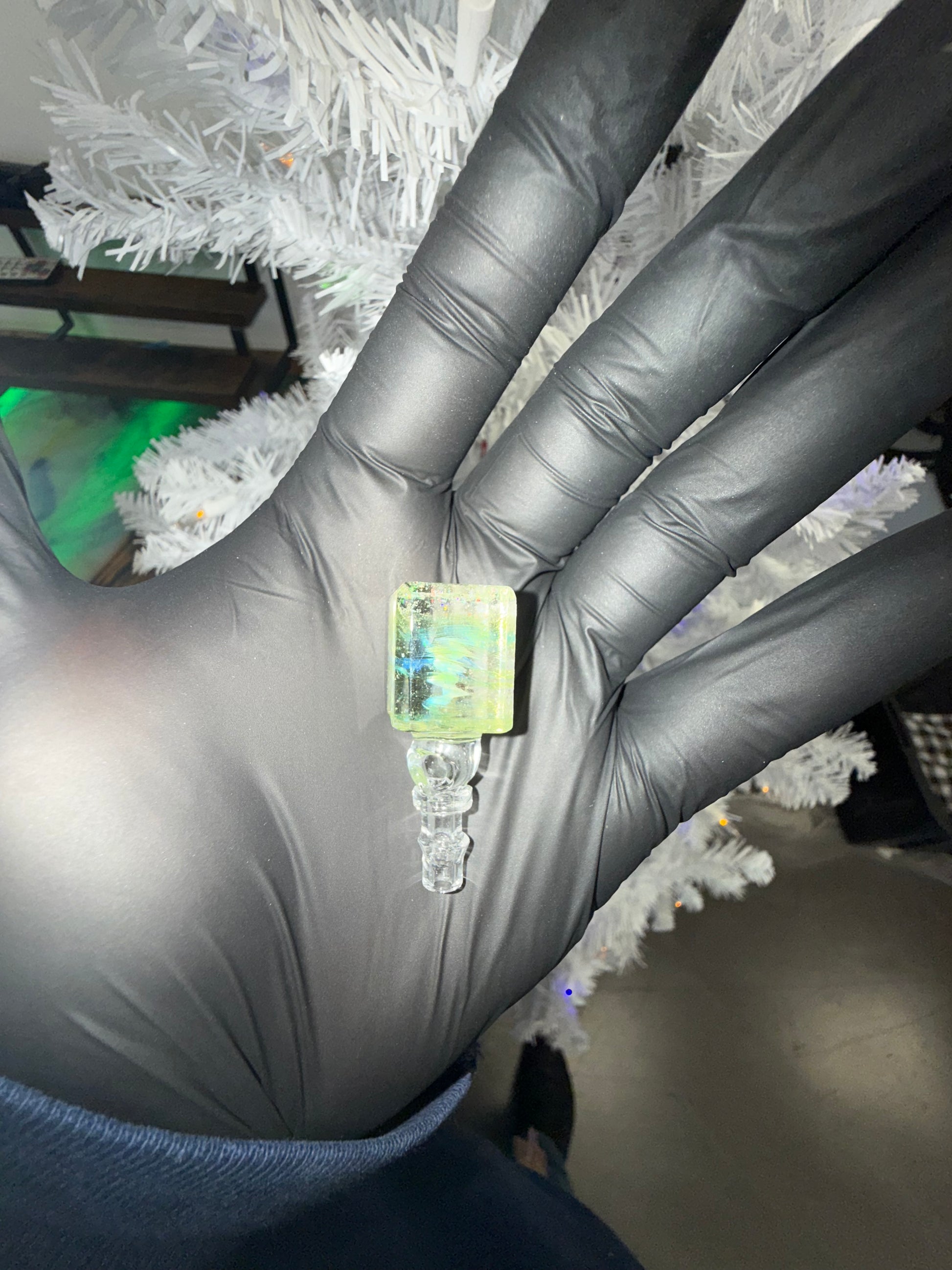 This handcrafted Puffco joystick by Heady Hawaii brings island vibes straight to your rig. A thick, rectangular slab of soft yellow glass floats above a crystal-clear handle, packed with tiny air bubbles and streaks of sea-green color that look like light cutting through tropical water.
