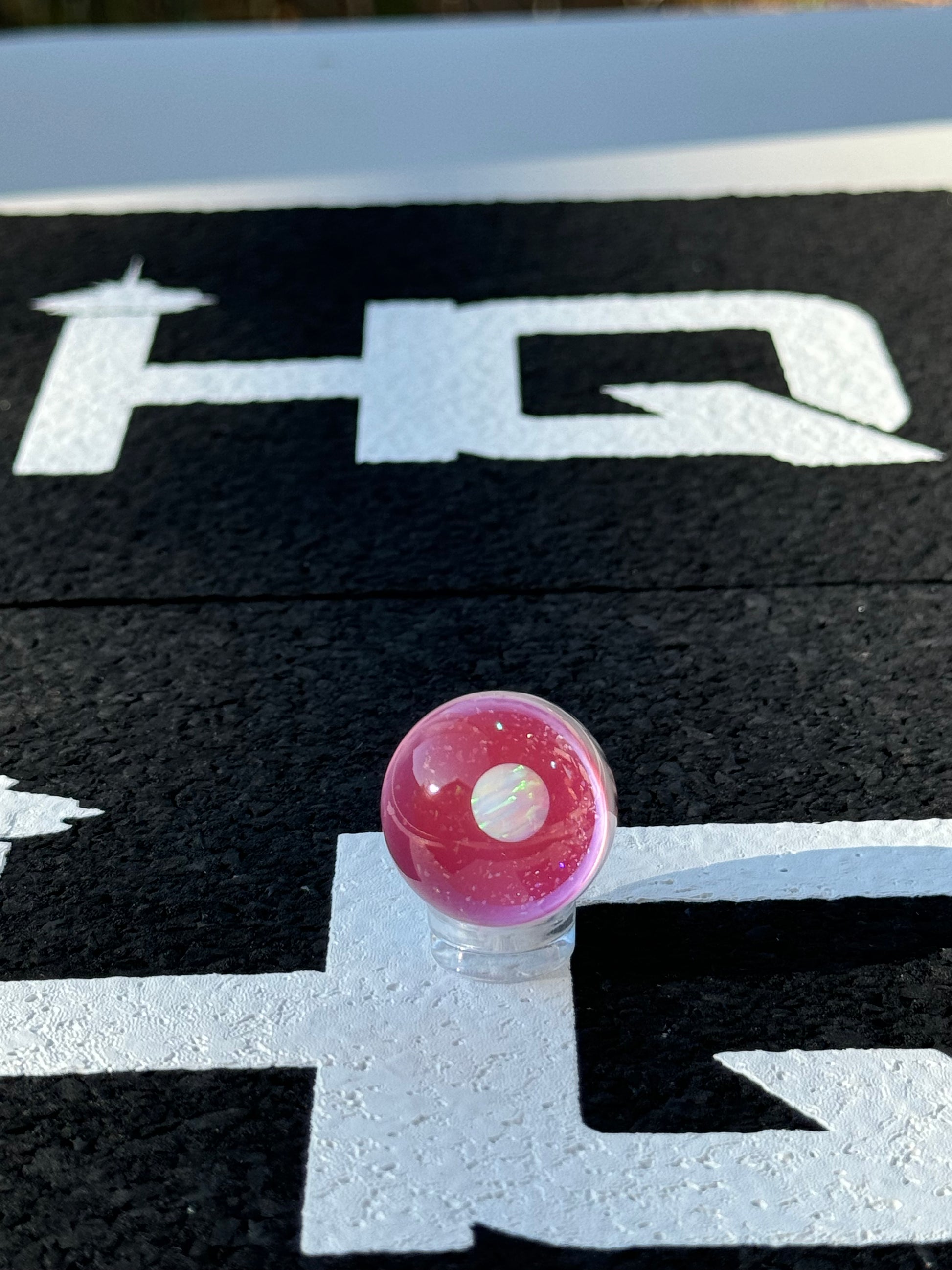 The second marble captures a softer cosmic energy a pink galaxy hue that glows under light, highlighted by a vibrant encased opal floating at its center. Tiny specks shimmer throughout, adding depth like stars in a pastel universe.
