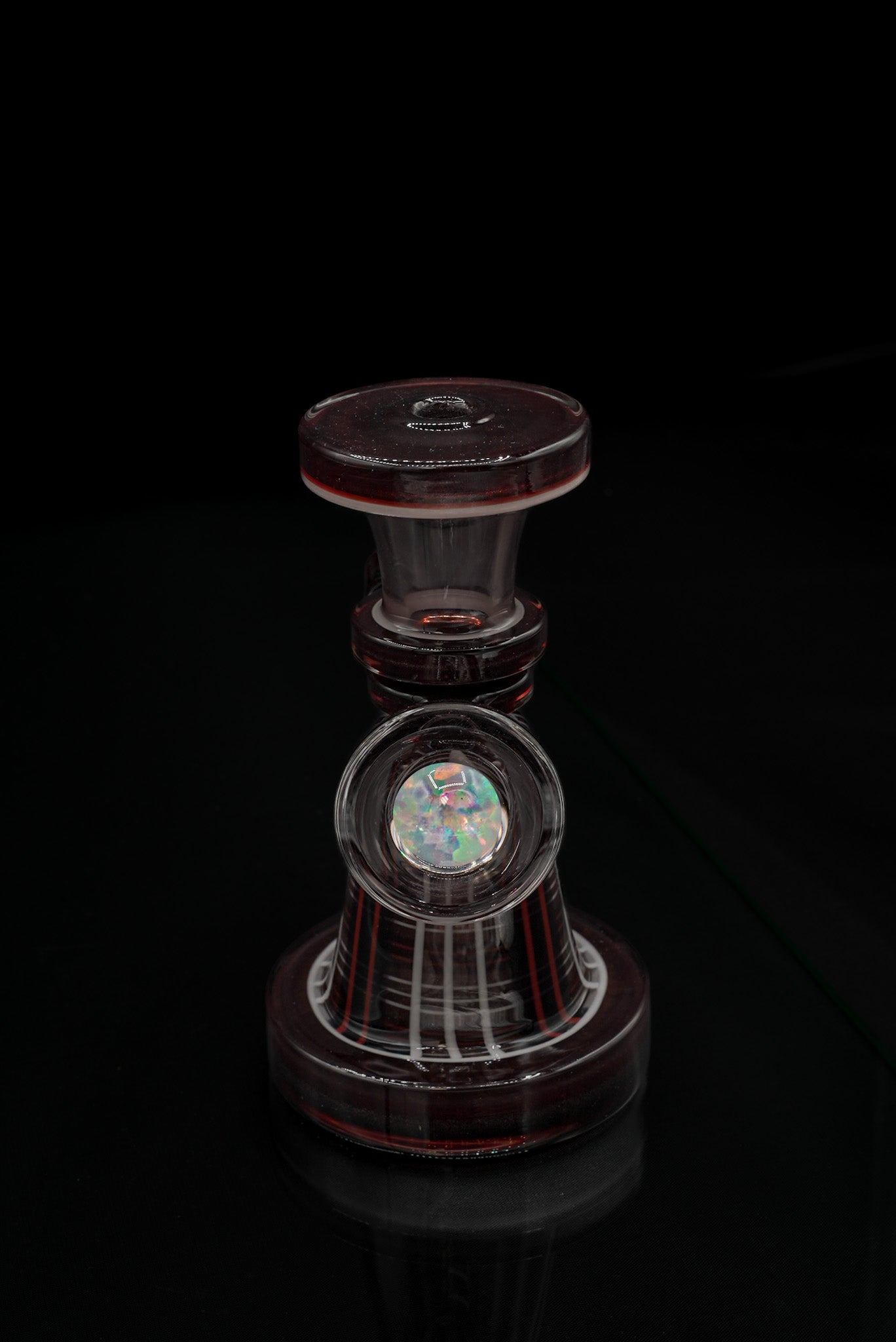 A stunning dichro mib catches and reflects light with prismatic brilliance, while the encased opal lens adds layers of shimmer and dimension. The compact yet powerful form makes it a centerpiece with purpose in a serious glass collection.